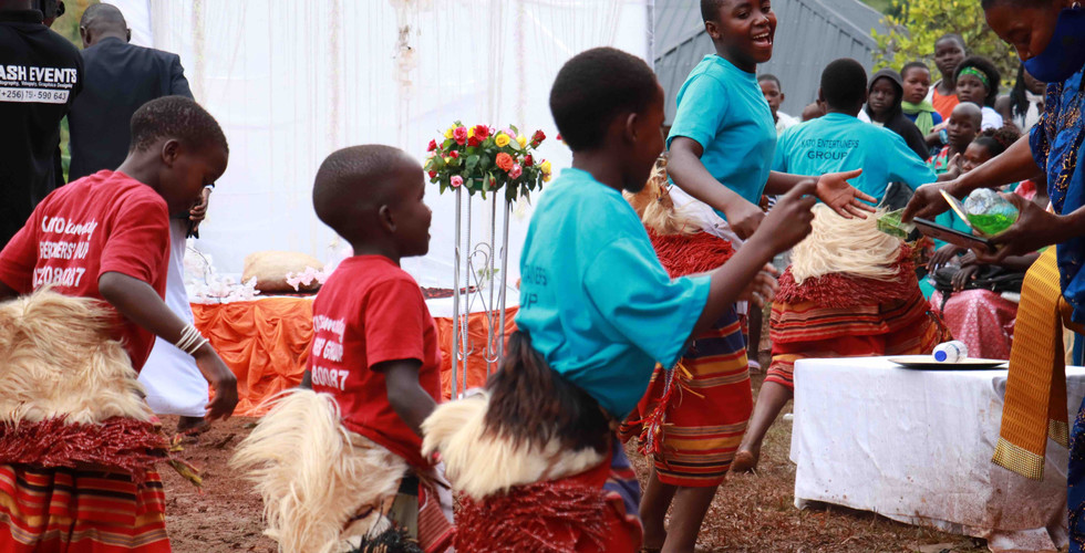 Aufgrund dessen, dass es den gesamten Vormittag geregnet hat, ist der Boden, der nur aus Erde besteht, dementsprechend „vorbereitet“. Wir lauen also langsam über den schlammigen Boden und tanzen zu der Musik. Ich als Weißer mit dabei falle natürlich besonders auf! „Muzungu“ rufen alle, klatschen und jubeln uns zu. Als wir im Entenmarsch bis vor die Zelte gelaufen sind, bleiben wir stehen und bekommen ein paar Fragen gestellt. Ich bekomme das Mikrofon in die Hand gedrückt und darf die Gesellschaft grüßen. Die Moderatoren sprechen weiter und ich verstehe nichts von alledem. Doch wir haben unseren Auftritt wohl gut performt und dürfen wieder abtreten. Während ich mich wieder hinsetzte, kommen mir meine drei Freunde in ihren bunten Gewändern schon entgegen, die dasselbe tun dürfen. Auch sie laufen mit einer großen Gruppe von Frauen durch den Schlamm, tanzen zwischen den vier Zelten und stellen sich vor.