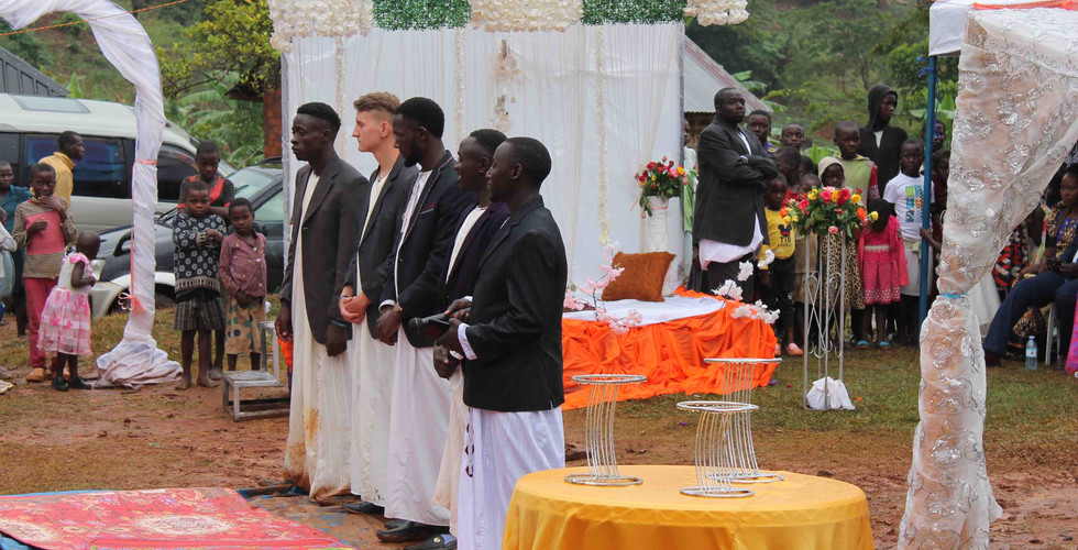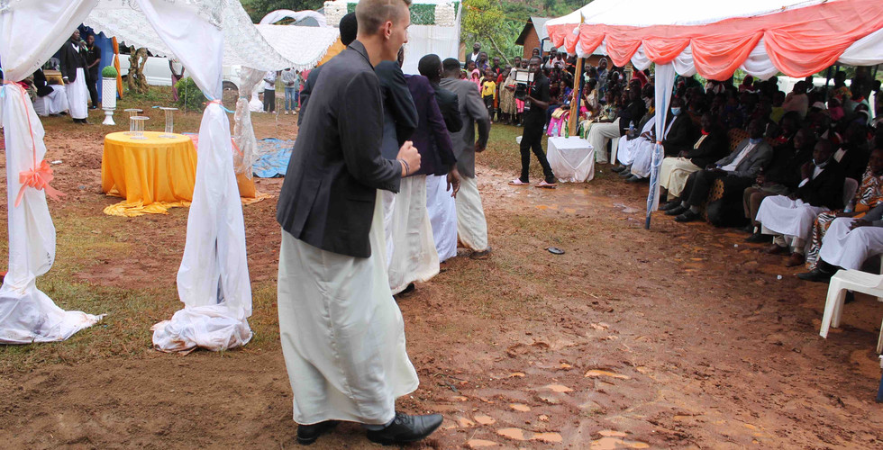 Wir begeben uns auf eine dreistündige Autofahrt und sammeln unterwegs Naomi und Annika, unsere deutschen Freunde, ein. Als wir ankommen, hören wir schon von weitem die laute durchdringende Musik und sehen ein paar weiße Zelte aufgebaut. Wir vier Freiwilligen steigen aus dem Auto aus und laufen in eines der Gebäude neben der Feier, um uns umzuziehen. Ich bemerke, dass bereits schätzungsweise 150 Gäste eingetroffen sind, die gespannt auf den Bräutigam und seine Frau warten. Ich ziehe meinen Kanzu an, der aus einem langen weißen Gewand und einem Sakko besteht, so wie es die Tradition bei den Männern ist. Die drei Damen tragen eine Gomesi. Dieses traditionelle bunte Kleid zeichnet sich besonders durch die bewusst hochgesteckten Schultern aus (siehe Bilder).